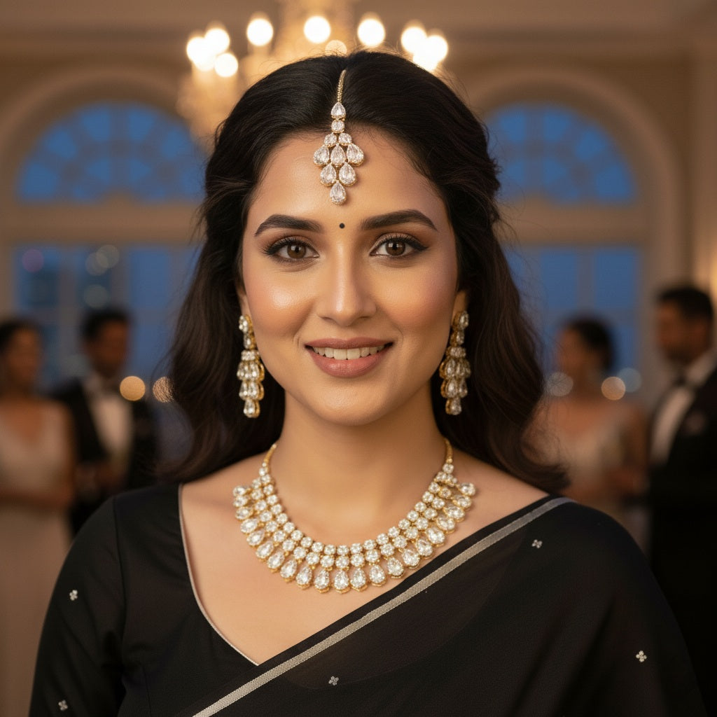 Elevate your festive attire with the Cascading Teardrop Jewelry Set, featuring a statement necklace, dangling earrings, and a matching maang tikka. Each piece is crafted with sparkling teardrop crystals set in rich gold, exuding timeless sophistication and refined elegance.