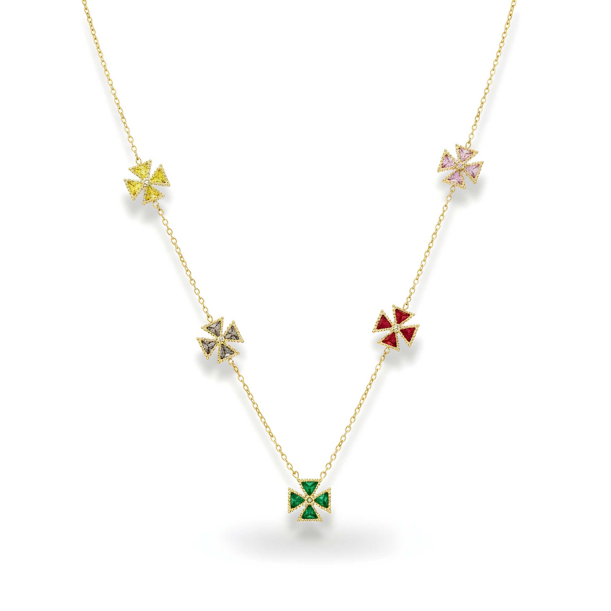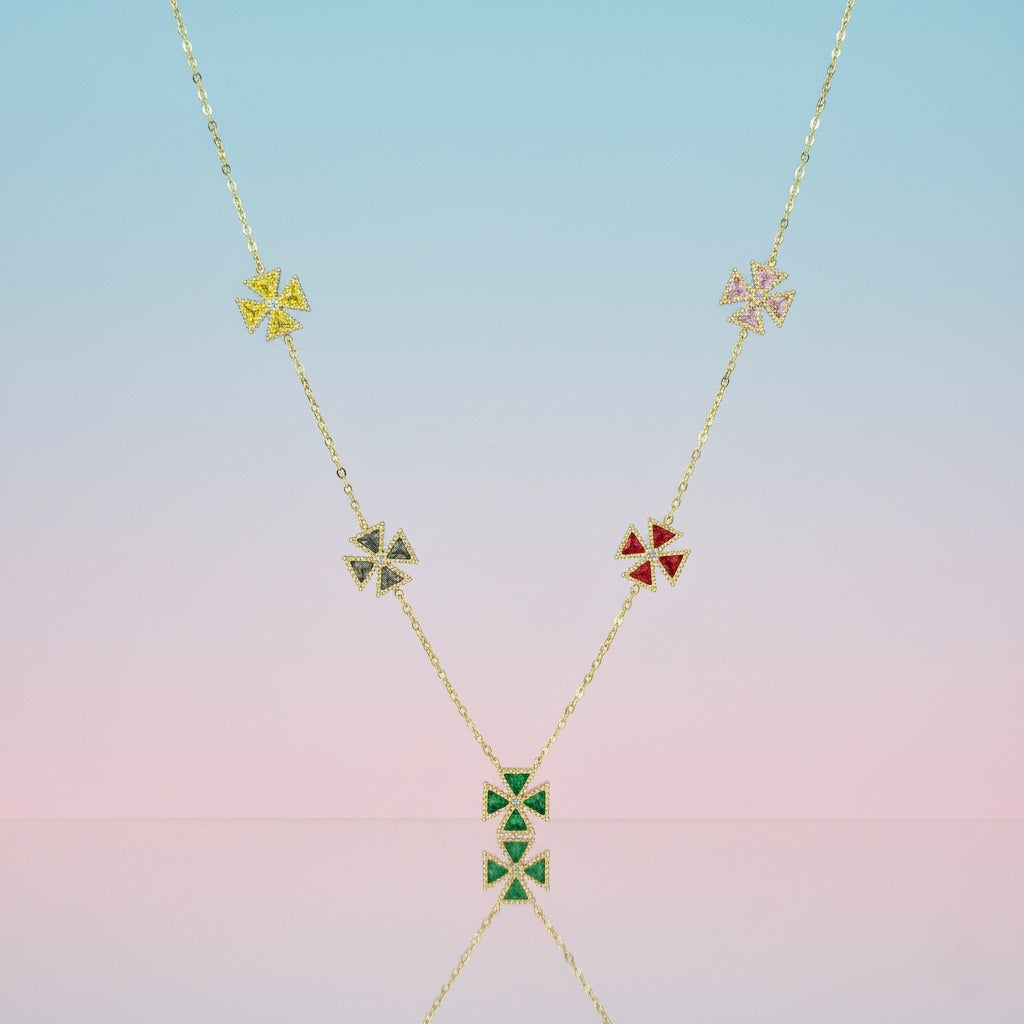 The Chromatic Charm Necklace features five geometric floral charms in vibrant jewel tones, set with sparkling pavé accents along a fine chain. This elegant piece adds a refined pop of color to any modern ensemble.