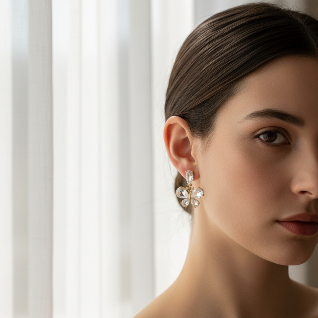 Diamond-Wing Butterfly Drops feature pear-shaped crystals forming radiant wings set in vibrant gold tones, offering a delicate yet sparkling touch to elevate any ensemble with graceful charm.