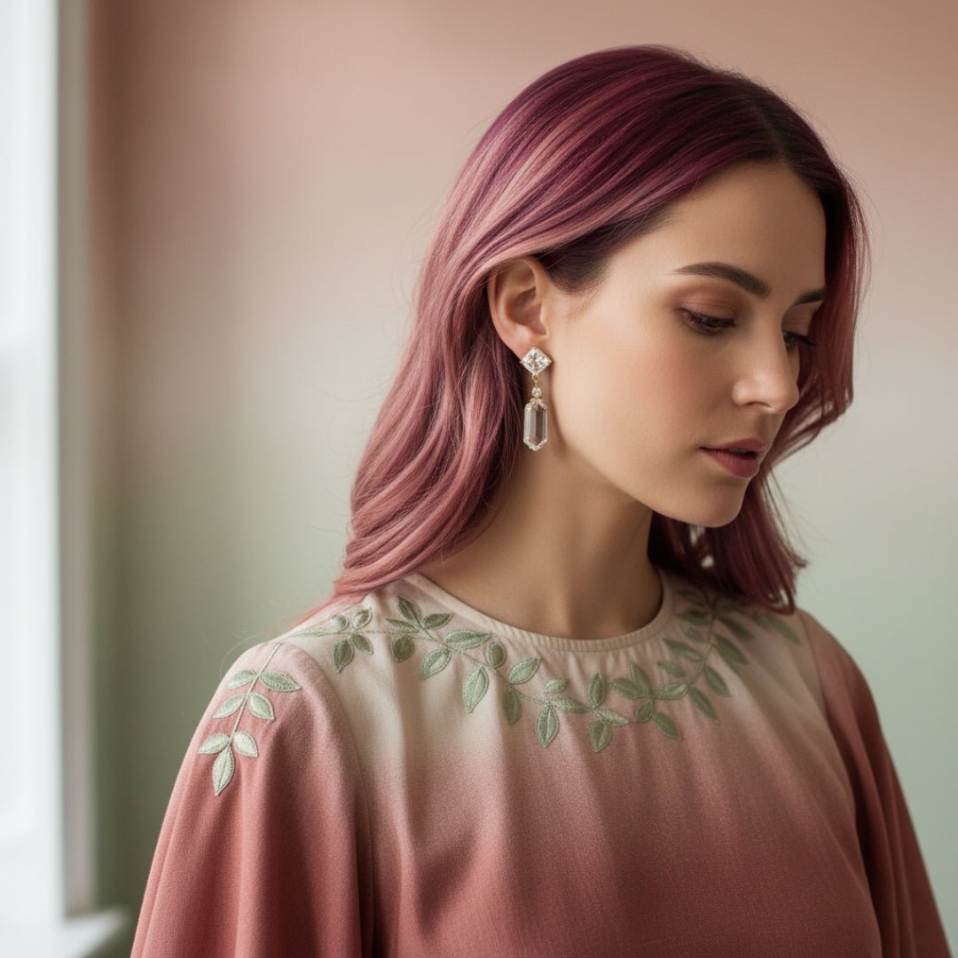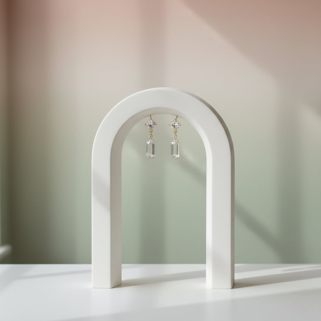 Geometric Brilliance Earrings showcase a square stud paired with a sleek rectangular drop, combining precision-cut crystals for a minimalist yet radiant design—perfect for adding modern elegance to any special occasion.