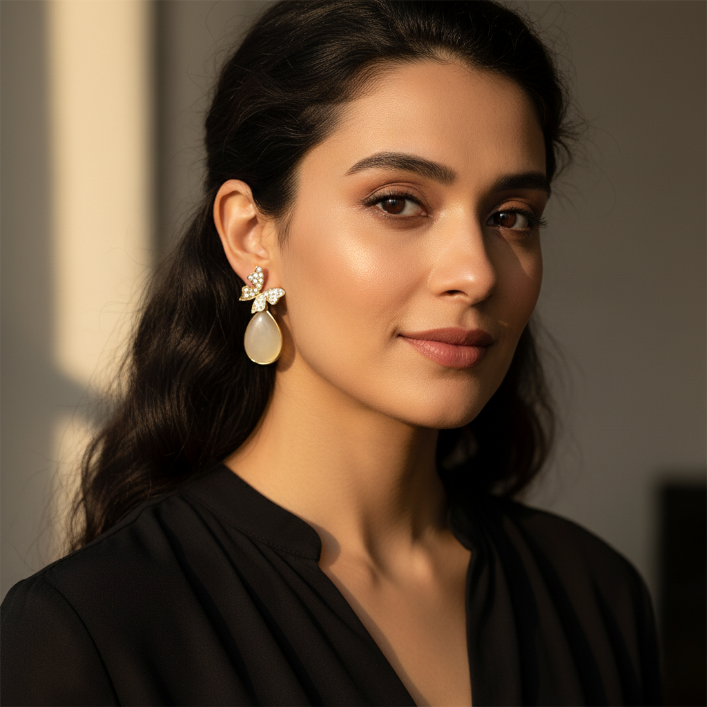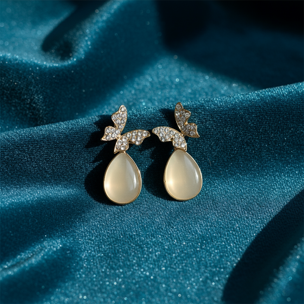 The Glimmering Moth Dangles feature pavé-crystal butterfly wings and a luminous teardrop cabochon, blending delicate sparkle with soft, moonlit elegance—an enchanting accessory for any occasion.
