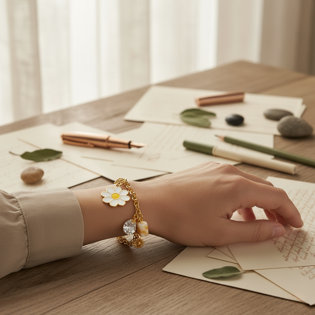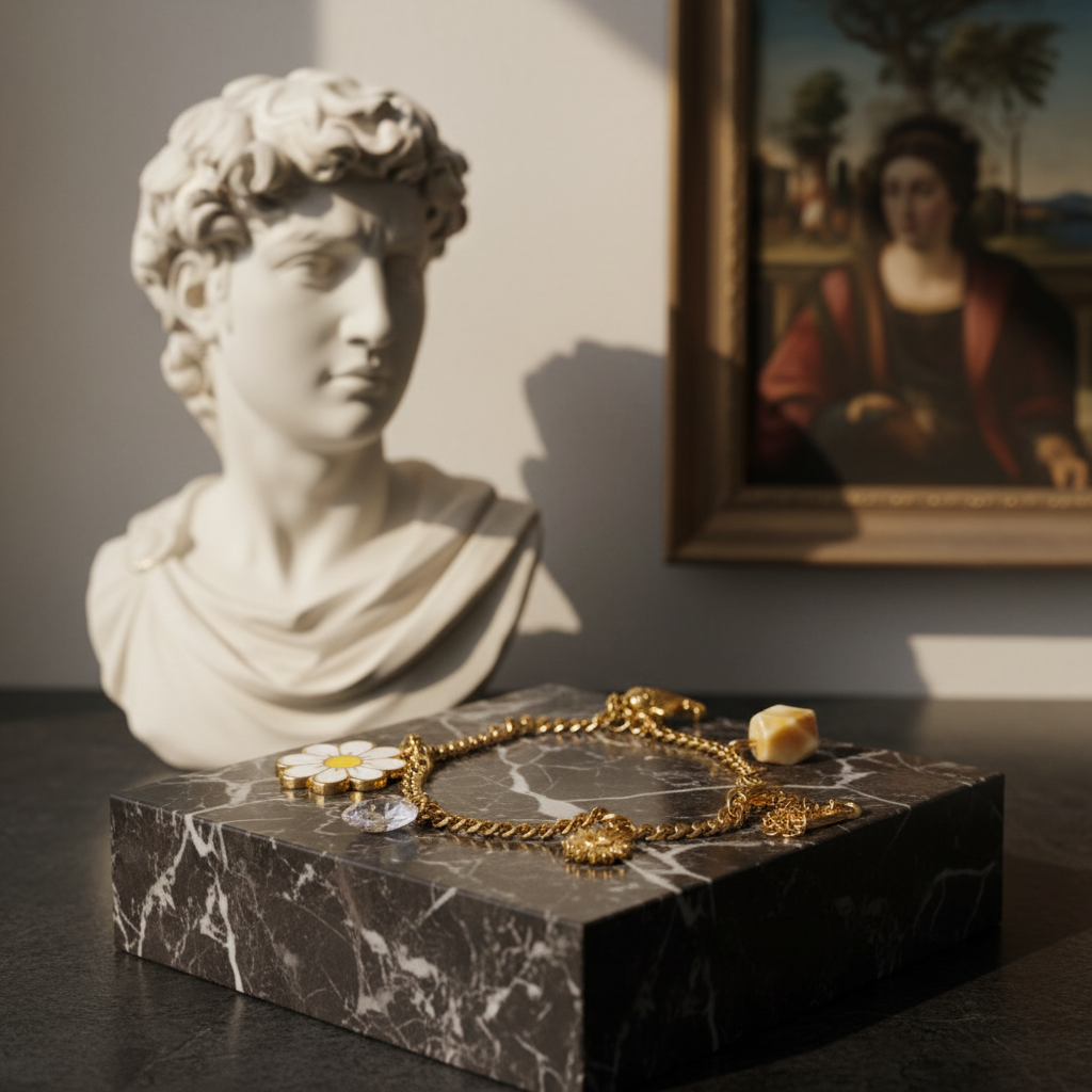 The Happy Charms Bracelet features a classic gold chain adorned with five vibrant charms—a daisy, sunburst medallion, sleek fish, clear gem, and marble. This playful, textured piece adds a unique bohemian flair to your style.