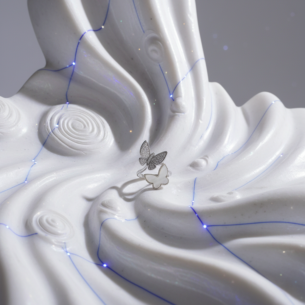 The Metamorphosis Butterfly Ring is a graceful open-cuff design, featuring two butterflies—one adorned with sparkling cubic zirconia and the other in luminous mother-of-pearl framed in gold and silver. This refined accessory symbolizes transformation and elegance, perfect for those embracing growth.