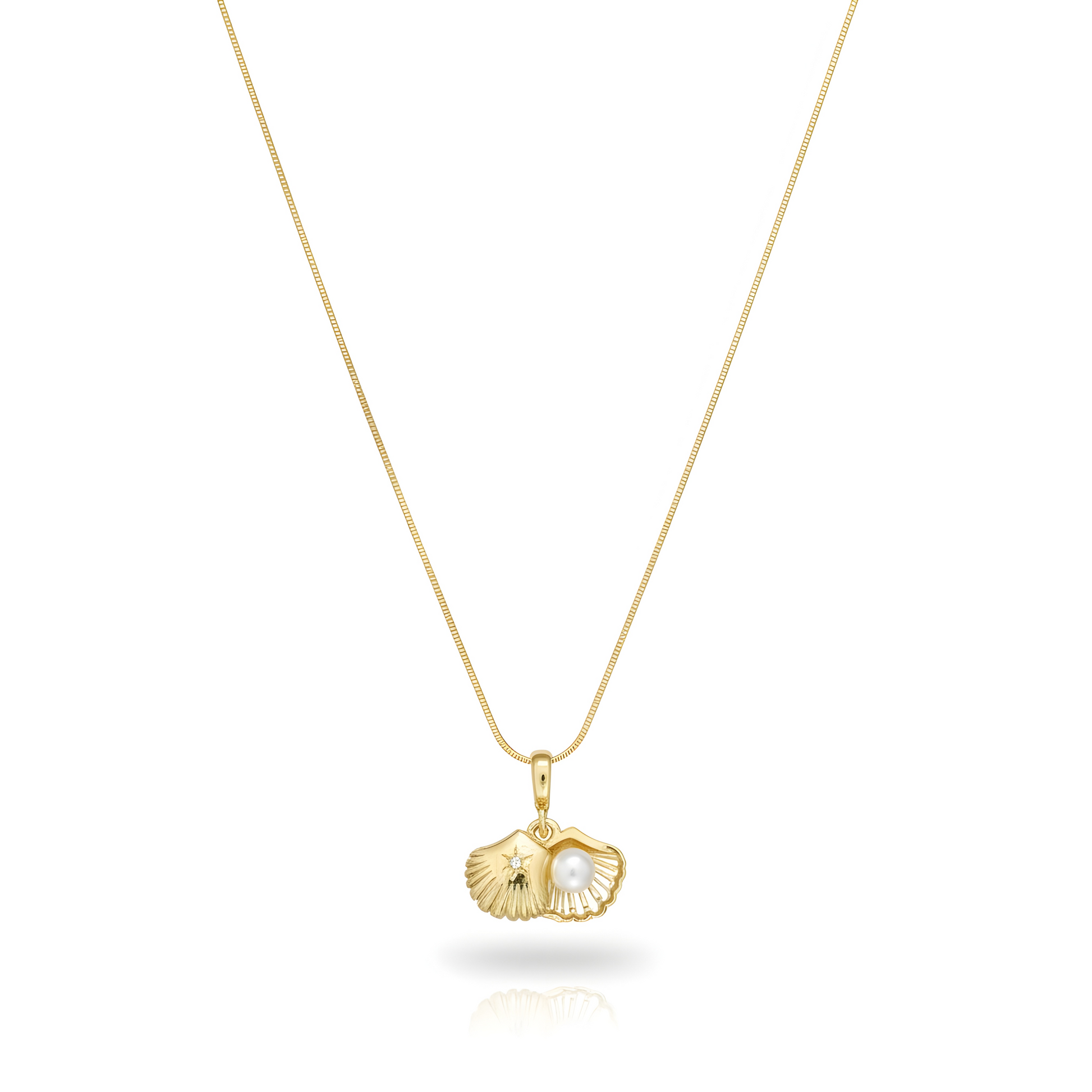 The Ocean's Treasure Necklace features a gold-toned clamshell pendant with a luminous freshwater pearl and delicate star detail, offering subtle nautical elegance.
