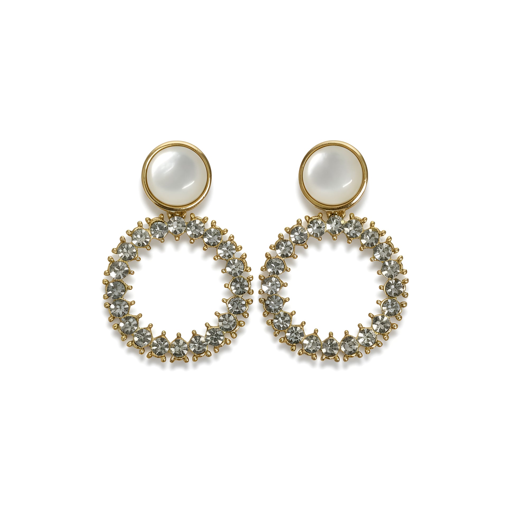 A chic combination of classic and contemporary, these drop earrings feature a shimmering round mother-of-pearl cabochon post. Below, a dazzling gold-tone hoop is studded with sparkling crystals, offering refined sparkle for any outfit.