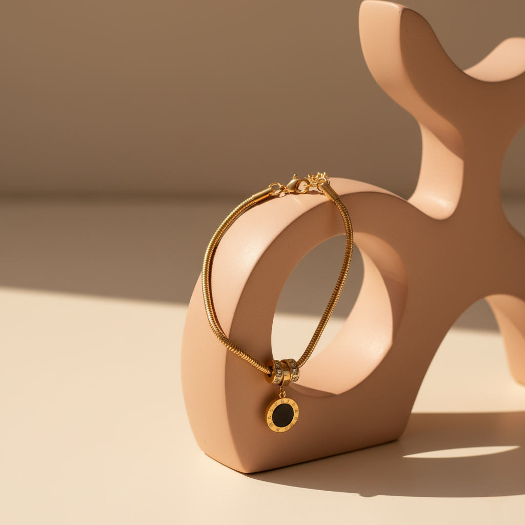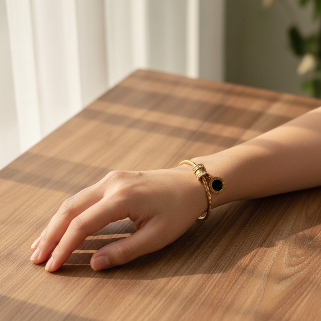 The Roman Charm Bracelet features a sleek rose gold-tone chain paired with a refined charm showcasing an engraved Roman numeral dial, accented by pavé-encrusted rondelle beads. This elegant piece combines timeless sophistication with modern flair.