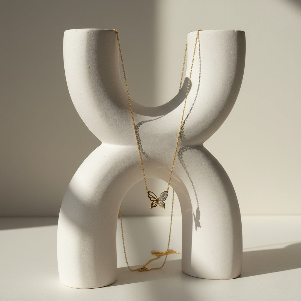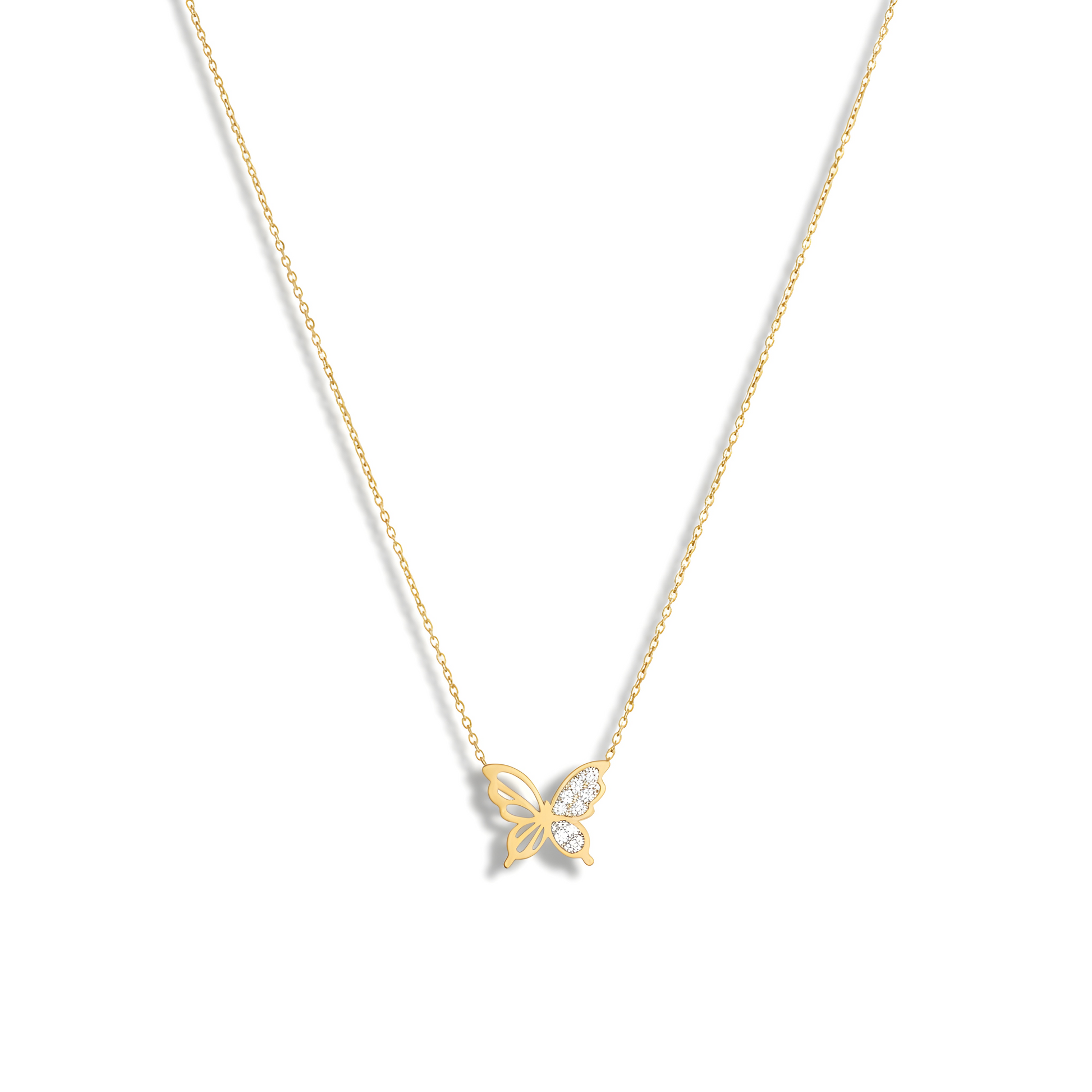The Shimmering Wings Necklace blends modern elegance with classic charm, featuring a butterfly design with a polished gold wing and a pavé stone-studded counterpart, creating a refined, radiant accessory.