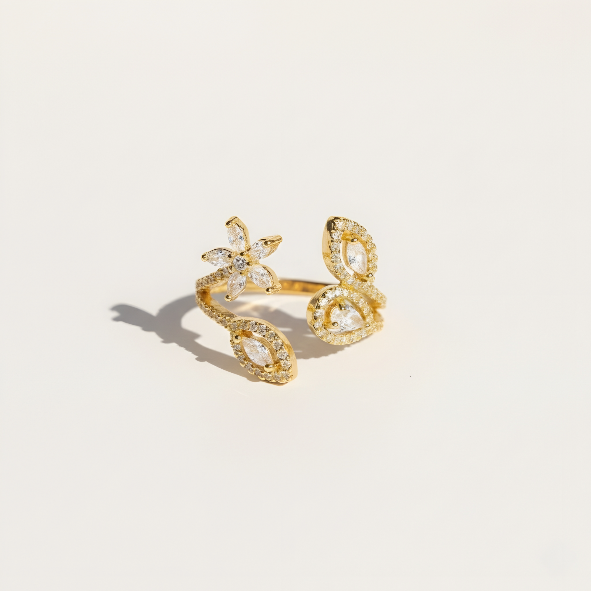 The Whispering Petals Ring showcases an open-cuff design in gold & rose gold tone, featuring a pave-stone flower and leaf motif. Its graceful curves add a romantic, nature-inspired accent to any outfit, perfect for both everyday wear and special occasions.